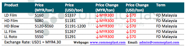 Market players reportedly received new local PE offers from another maker in Malaysia with MYR300/ton ($70/ton) reduction compared to last month for all PE grades.