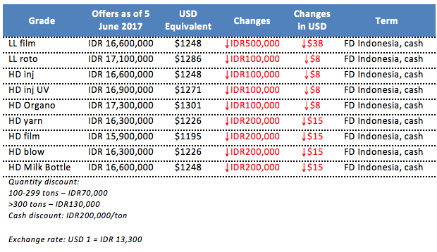 It is reported that another Indonesian producer has announced fresh weekly PE offers to domestic buyers with large reduction observed on LLDPE film cargoes, while other materials only recorded small to moderate cuts. The producer’s latest price list and changes are shown in the following table: