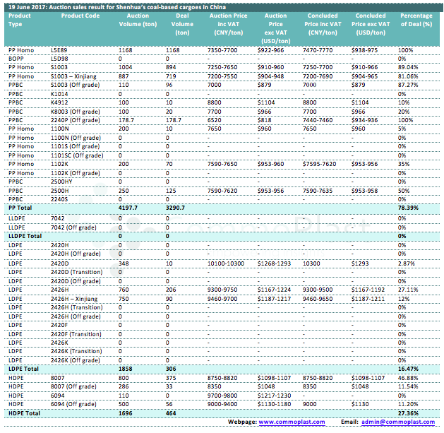 Auctions sales result for Shenhua’s coal-based polyolefin products in domestic China are as following: