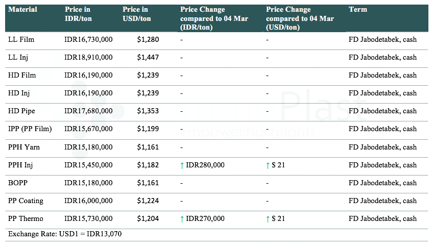 A major Indonesian maker has increased IDR27000-28000/t ($21/t) for its homo-PP injection and thermoforming homo-PP while maintaining offers unchanged for the remaining grades compared to previous offers on Monday, 07 March 2016. The latest price levels of the producer are shown in the following table: