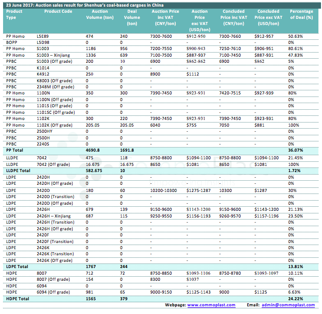 23 June 2017: Auction sales result for Shenhua's coal-based cargoes in China