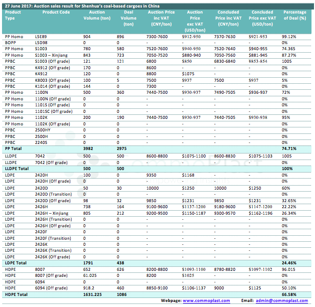Auctions sales result for Shenhua’s coal-based polyolefin products in domestic China are as following: