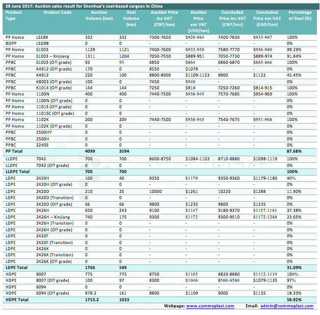 29 June 2017: Auction sales result for Shenhua's coal-based cargoes in China