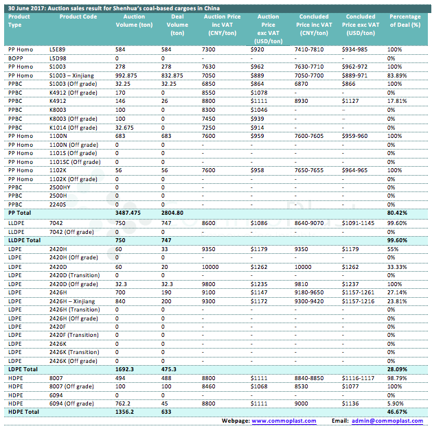 Auctions sales result for Shenhua’s coal-based polyolefin products in domestic China are as following: