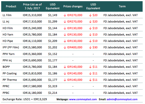 An Indonesian producer has announced fresh PP and PE offers to local market today with reduction compared to the last price opening during mid-June. Latest price list and changes are shown in the following table.