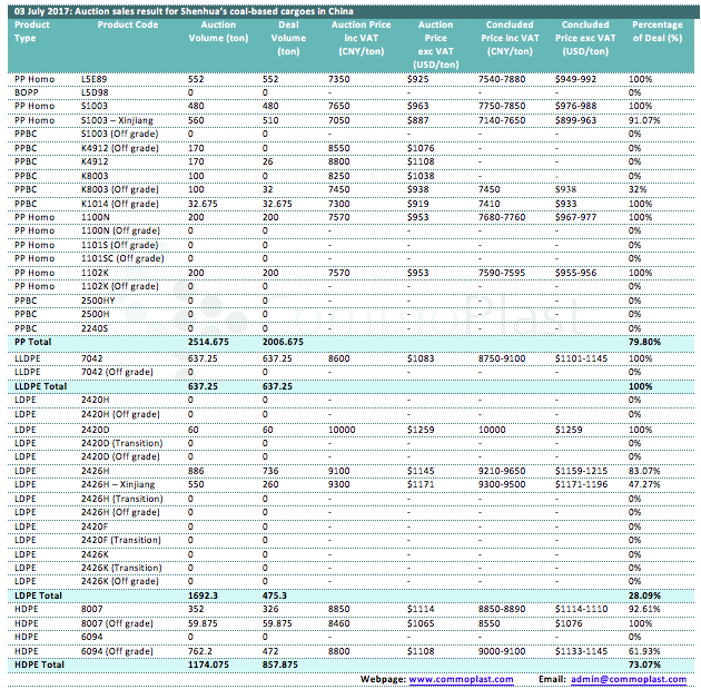 03 July 2017: Auction sales result for Shenhua's coal-based cargoes in China