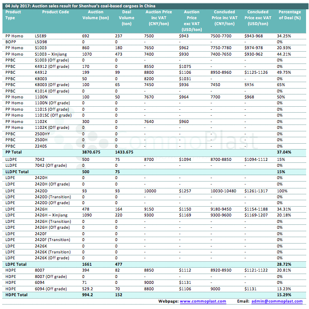 04 July 2017: Auction sales result for Shenhua's coal-based cargoes in China