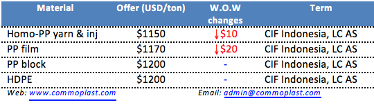 A major Thailand producer has announced fresh PP and HDPE prices to Indonesia after nearly three weeks absence due to the long holiday in this market. The maker reportedly cuts homo-PP and PP film prices by $10-20/ton while maintaining PP block and HDPE unchanged. Latest price list and changes are shown in the following table: