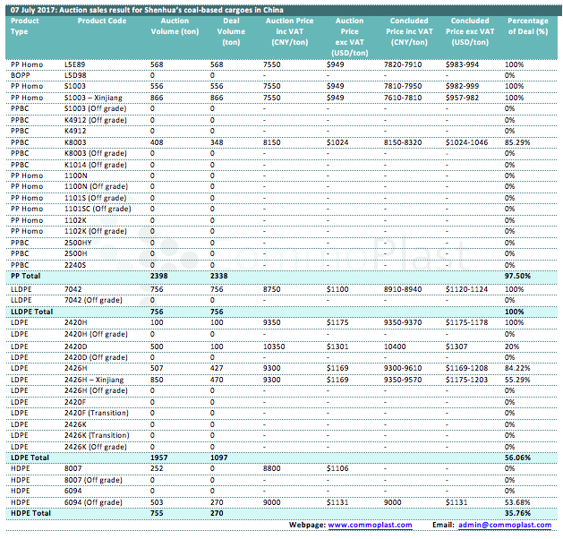 07 July 2017: Auction sales result for Shenhua's coal-based cargoes in China
