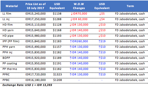 A major Indonesian producer has announced fresh weekly PP and PE prices to domestic buyers today with additional reduction on PE cargoes. This is because healthy supply and weak demand in the PE market persists in the post holiday term. Meanwhile, most PP cargoes witness increases with PP film (IPP) recorded significant hike of IDR260,000/ton ($19/ton) week on week basis.