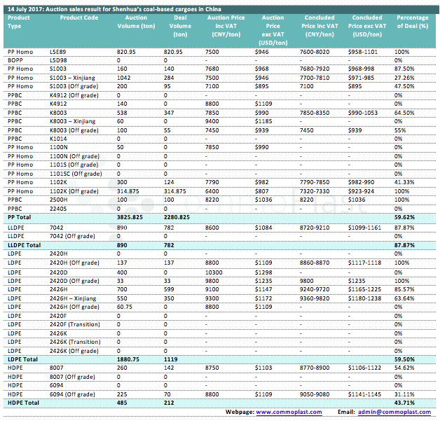14 July 2017: Auction sales result for Shenhua's coal-based cargoes in China