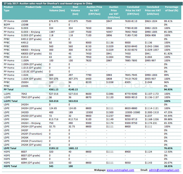 Auctions sales result for Shenhua’s coal-based polyolefin products in domestic China are as following: