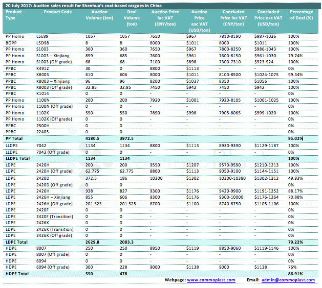 Auctions sales result for Shenhua’s coal-based polyolefin products in domestic China are as following: