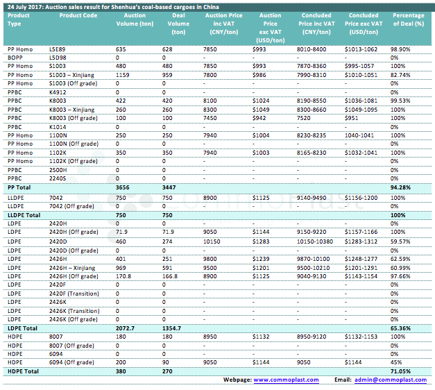 24 July 2017: Auction sales result for Shenhua's coal-based cargoes in China