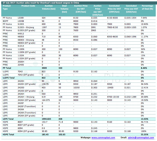 Auctions sales result for Shenhua’s coal-based polyolefin products in domestic China are as following: