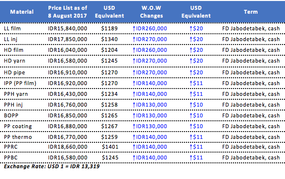 It is reported that a major local producer in Indonesia has announced fresh weekly PP and PE offers today with additional hike, marking six consecutive weeks of increases for PP. Market is gaining momentum with general tight supply across Asia and strong upstream costs. However, the strong buying interest observed during late July is now diminishing, leaving the firming trend hanging on supply concern but lacking support from demand.