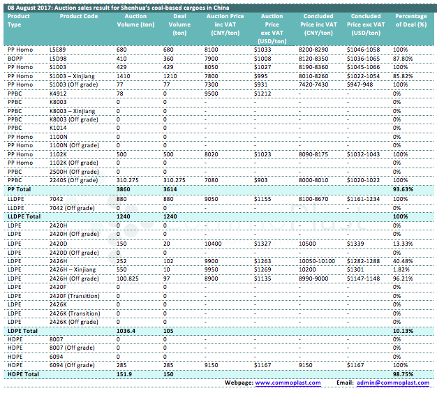 Auctions sales result for Shenhua’s coal-based polyolefin products in domestic China are as following: