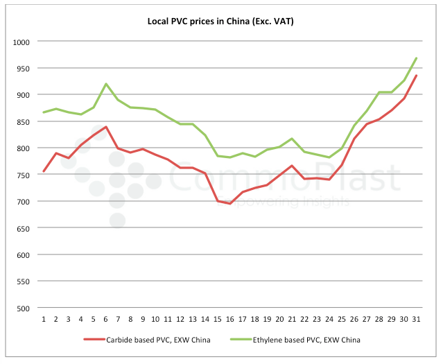 Chinese players this week reported receiving new PVC offers from local producers with CNY200-400/ton ($30-60/ton) increased, as supply condition remains pretty tight. Ethylene based PVC hit above the CNY7500/ton threshold to trade at CNY7600/ton ($958/ton without VAT) while carbide based PVC ranging at CNY7300-7450/ton ($920-939/ton without VAT), all based on EXW China, cash term.