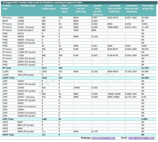 Auctions sales result for Shenhua’s coal-based polyolefin products in domestic China are as following: