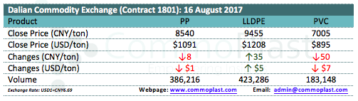 Contract number 1801 on Dalian Commodity Exchange on 16 August 2017 settled as following: