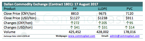 Contract number 1801 on Dalian Commodity Exchange on 17 August 2017 settled as following: