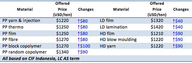 It is reported that a major Malaysian producer has announced fresh PP and PE offers to Indonesia for September shipment with relatively large hike from last month, especially on PP and HDPE cargoes. This is due to low operating rate at Malaysia plant and a source close to the producer added, “We are working to stabilise the operating rate at one of the cracker after maintenance, hence downstream PP and PE units are affected. Demand in Southeast Asia is not strong, however we hope the see some positive spillover effect from China.”