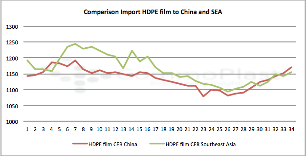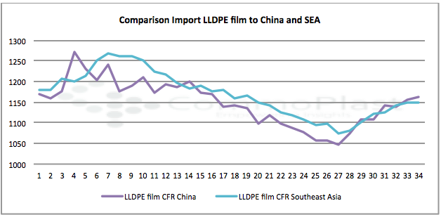 Import HDPE and LLDPE film to China has been constantly following the up-trend since early July 2017 following limited supply from Thailand, Taiwan, Iran and Qatar suppliers. From mid of August, international suppliers implement larger hike to the country as buying appetite improve, leading to the fact that import HDPE and LLDPE film are now traded at premium over Southeast Asia.