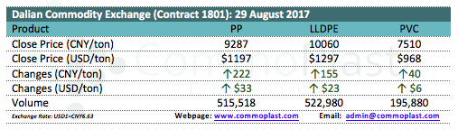 Contract number 1801 on Dalian Commodity Exchange on 29 August 2017 settled as following: