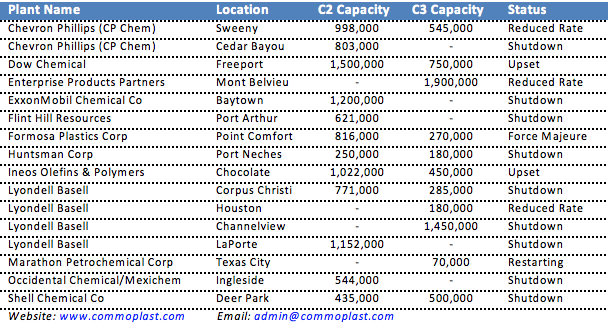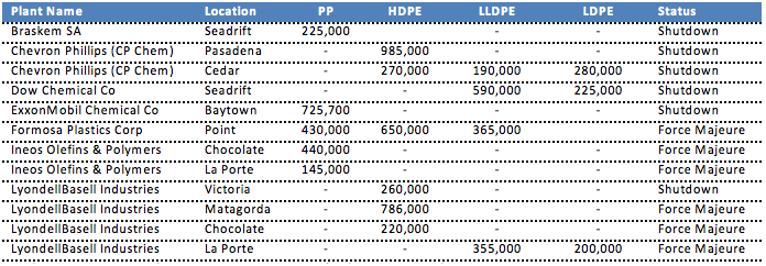 An updated list of crackers and PP, PE plant shutdown due to the event is shown in the following table:
