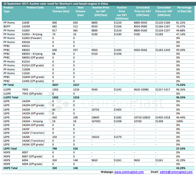 12 September 2017: Auction sales result for Shenhua's coal-based cargoes in China