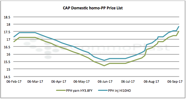 Local traders reported facing slower sales condition this week as buyers hold tight to the belief that a price correction is necessary. In fact, converters in the woven bag sector are encountering difficulties in transferring high raw material costs to end product prices, especially when a fertilizer tender has been canceled. A buyer commented, “We have been waiting on the side-line throughout this week with comfortable inventories on hand. Prices increase too quickly while demand is not catching up. We think market might witness small downward adjustment by mid-October.”