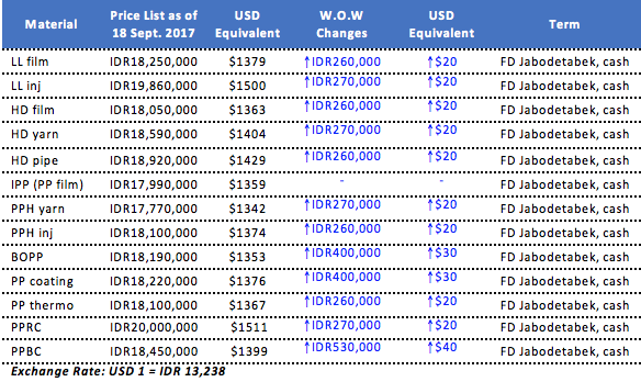 A major domestic producer in Indonesia has announced new PP and PE offers to local buyers with additional increases of $20-40/ton from last week. Tight supply and strong upstream costs are cited as the main support for the move, despite shrinking buying interest.