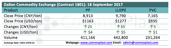 Contract number 1801 on Dalian Commodity Exchange on 18 September 2017 settled as following: