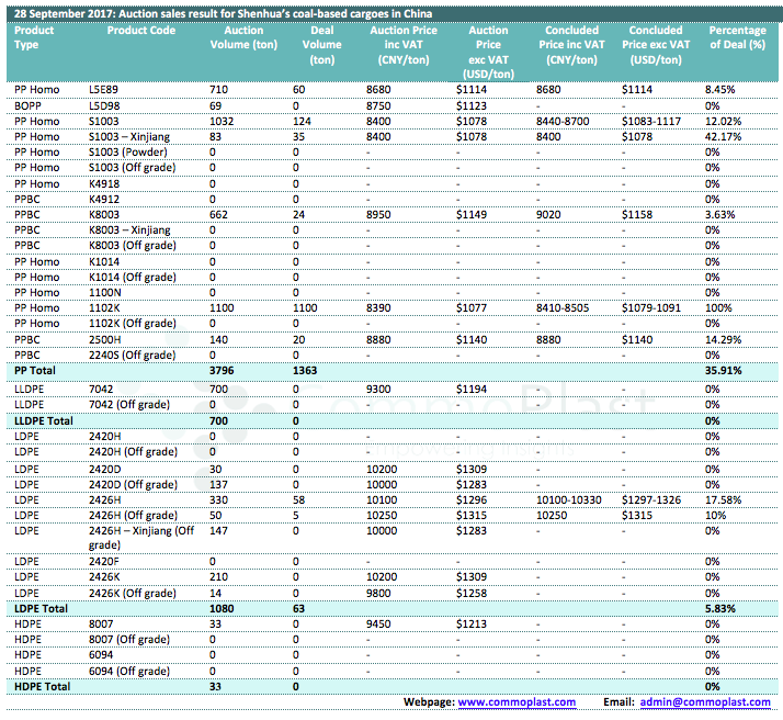 28 September 2017: Auction sales result for Shenhua's coal-based cargoes in China