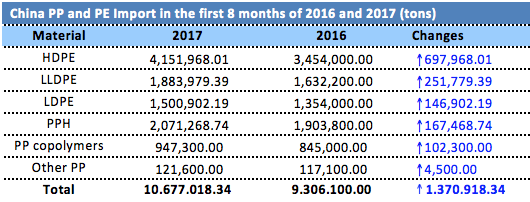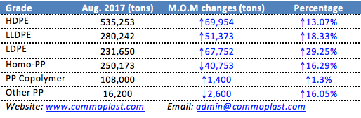 Import PP and PE to China in August 2017 continues to post healthy growth month on month, according to the latest data from Chinese Custom Department. The arrival of these cargoes has eased the local supply tightness condition slightly, and while there has not been official data for September, players are speculating strong growth in import cargoes too.
