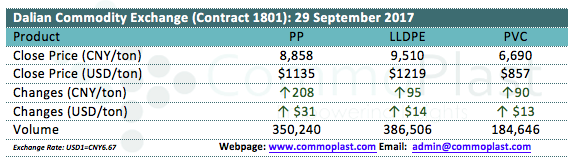 Contract number 1801 on Dalian Commodity Exchange on 29 September 2017 settled as following:
