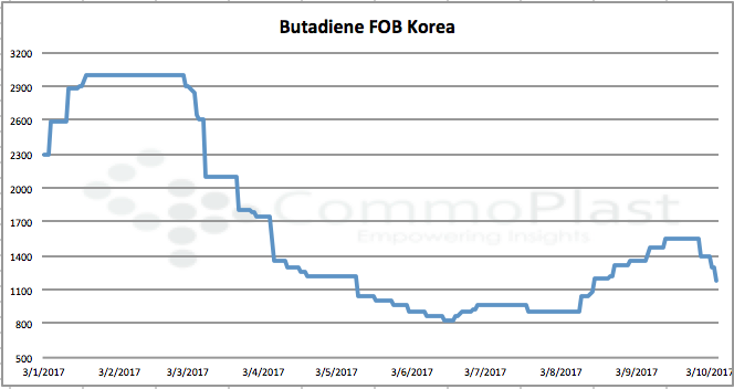 The Asian butadiene market has been falling throughout the holiday week in China, with FOB Korea cargoes loosing approximate 24 per cent in value or $370/ton compared to a week earlier, reaching $1180/ton on 6 September 2017.