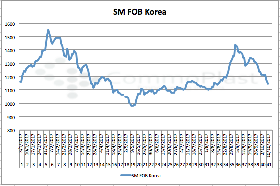 The Asia styrene monomer (SM) market has been falling during the previous week, when Chinese players were away for the long National Day holiday. The downtrend gains speed this week, plunging about $65/ton from last Friday, to reach $1148/ton FOB Korea term.