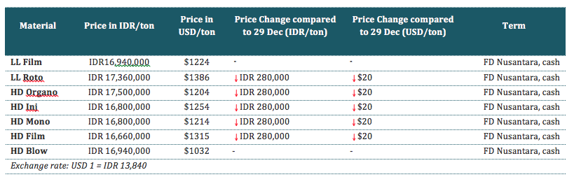 Market players reported that another major Indonesian producer has decreased their PE prices down compared to the last offer given on 29 Dec 2015 in which the offers for LLDPE roto and HDPE reduced IDR280,000/t ($20/t) and LLDPE film remained stable. The latest prices and reduction amounts are shown in the following table: