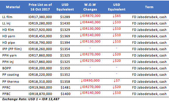 A major domestic producer in Indonesia cuts local PP and PE prices for the first time in sixteen weeks with LLDPE film faces the deepest plunge. Market sources are blaming the persistent weak buying interest for the softening trend.