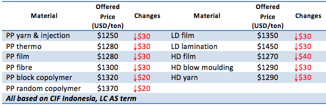 Malaysian maker cuts November PP, PE offers to Indonesia