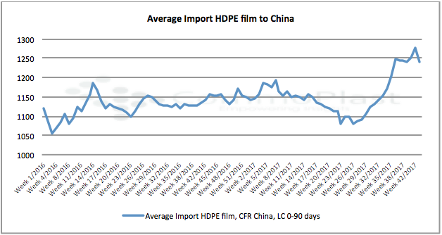 The recent escalated HDPE film demand in China has attracted a great number of cargoes from overseas sellers, including re-export parcels from Southeast Asia. Most of these shipments are scheduled to arrive by second half of November, which caused severe concern regarding the medium term outlook.