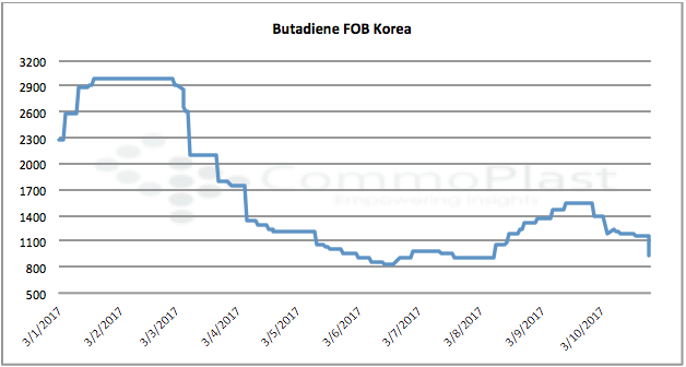 The Asian butadiene market nosedived last Friday to $940/ton FOB Korea term – the lowest levels since late July, due to weak buying interest and bloated inventories in local China market. Industry participants are expecting further decline in the near term citing the fact that many Chinese suppliers are exporting butadiene to the regional market.