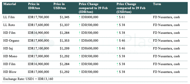 Another major producer in Indonesia has adjusted their PE offers for local market with IDR500000-800000/t ($38-61/t) increased for LLDPE and IDR 500000-600000/t ($38-46/t) hike for HDPE today compared to their previous offers last month. The latest price levels of the producer are shown in the following table: