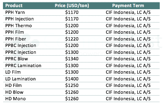 A major producer from Southeast Asia has announced new offers for PP and PE to Indonesian market today with significant increases compared to last month. Players attribute such big hike to limited supply, firming upstream costs and healthy demand in Indonesia market, especially for homo-PP raffia grades.