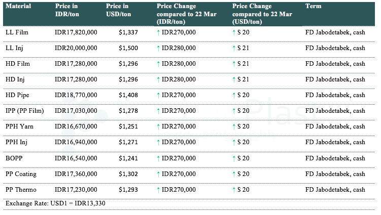 Players in Indonesia informed that a major local producer has lifted local PP and PE offers on the first trading of the week with IDR270000-280000t ($20-21/t) hike compared to last week, which buyer attributed to a stubborn supply tightness condition.