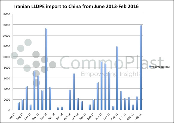 Data from Chinese Custom Department showed import LLDPE from Iran to China in the short working month of February 2016 increased by almost five folds compared to a month earlier, bringing Iran to be the fourth biggest LLDPE supplier to China just behind Singapore, Saudi Arabia and Thailand.