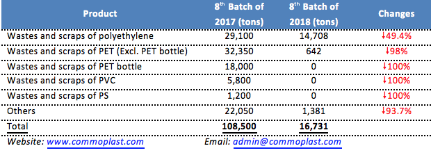 In the eighth batch of approved companies to import waste plastic to China released on 16 March 2018, the quantity dropped sharply compared to the same batch last year.