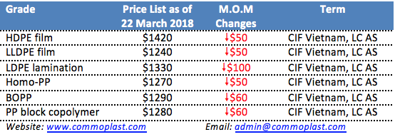 Another major Saudi Arabia producer has announced April shipment offers for PP and PE to Vietnam with a large reduction from the previous month. This is a result of the constantly weakening trend since after the long Lunar New Year holidays.