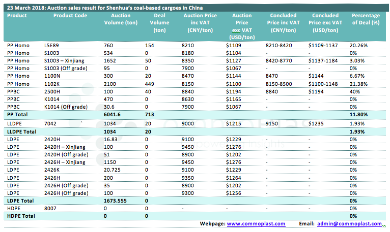 Auctions sales result for Shenhua’s coal-based polyolefin products in domestic China are as following:
